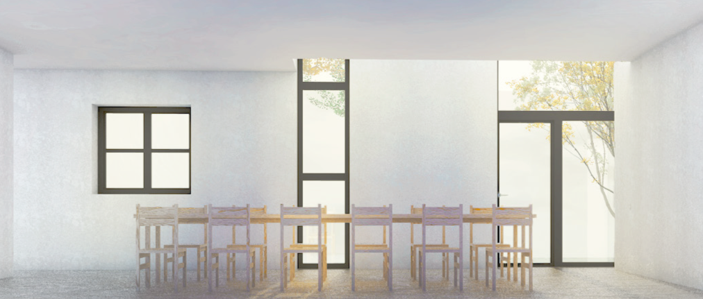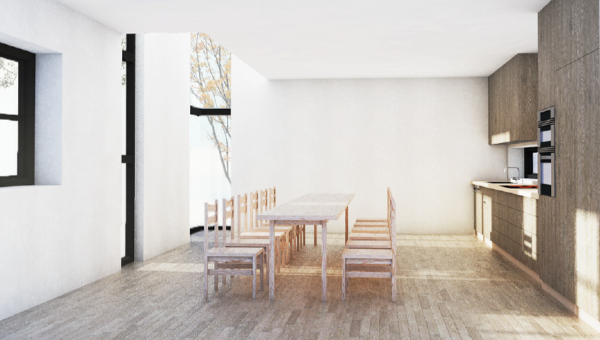 Prosjektet arbeider bevisst med vertikalitet og lysføring gjennom nye vindusfelt og åpninger. Et gjennomgående hjørnevindu over to etasjer åpner bygget mot vest og nord, og bidrar til forbedrede dagslysforhold og visuelle forbindelser mellom etasjene. Første etasje er utformet som et fleksibelt fellesrom som kan romme ulike aktiviteter gjennom dagen, og fungerer som et nytt samlende tyngdepunkt i boligen.