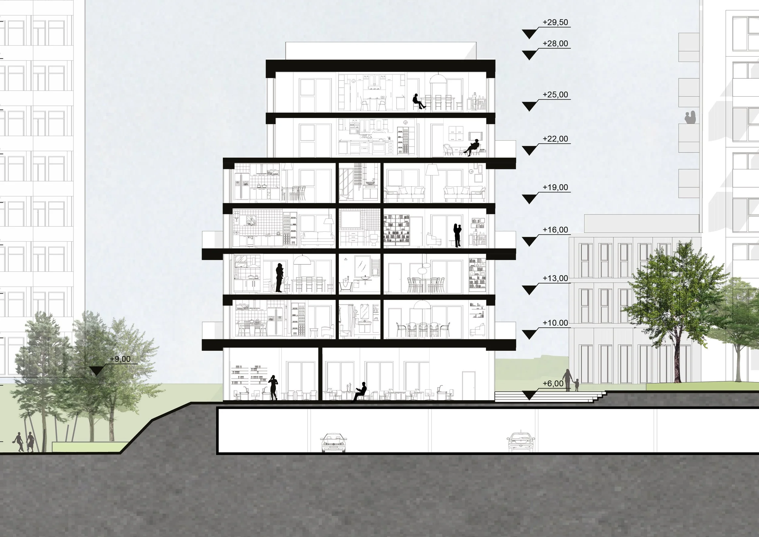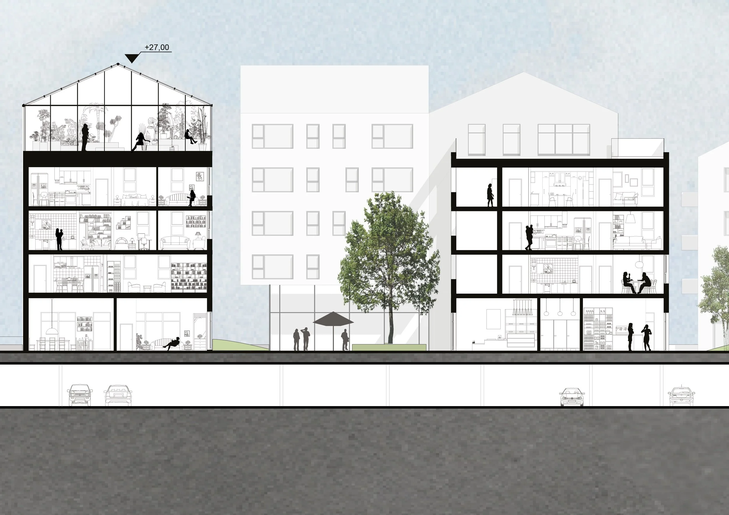 Min rolle: Konseptutvikling og iterativt arbeid med volumstudier og planstruktur, der snitt, plan og volum ble brukt parallelt for å teste tetthet, skala og overgangssoner mellom private, felles og offentlige rom.
