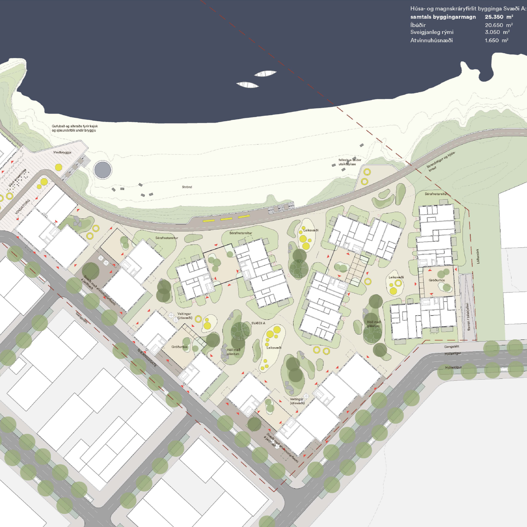 Planforslaget er strukturert rundt to hovedområder – område A og område C – med ulike romlige og typologiske strategier tilpasset deres respektive beliggenhet. Område A forholder seg til omkringliggende gater og åpner gradvis mot stranden gjennom bebyggelse som skaper ly, utsikt og gjennomgående forbindelser, samtidig som landskapet trekkes inn mellom bygningene. I område C foreslås en mer konsentrert bebyggelsesstruktur med punktbygg, som bevarer den smale kyststripen som et sammenhengende, åpent landskapsrom fremfor å fragmentere den.